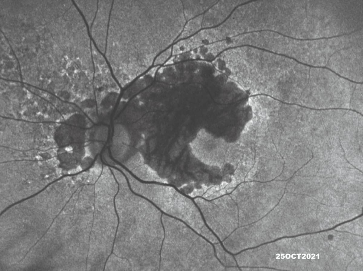 Pattern dystrophy is a less common group of disorders that present with a variety of pigmentary changes affecting the macula. When these dystrophies progress to significant RPE atrophy, the resulting fundus picture may mimic GA. A family history and detailed imaging are valuable tools in making the correct diagnosis. Other IRDs are much less common; yet, once they are sought, they can be found. Some of these conditions exhibit a phenotype characterized by choroidal atrophy. They do not typically have drusen, but they can have large, circular lesions that resemble GA. Genetic testing should also be performed in these situations (Figure 3).